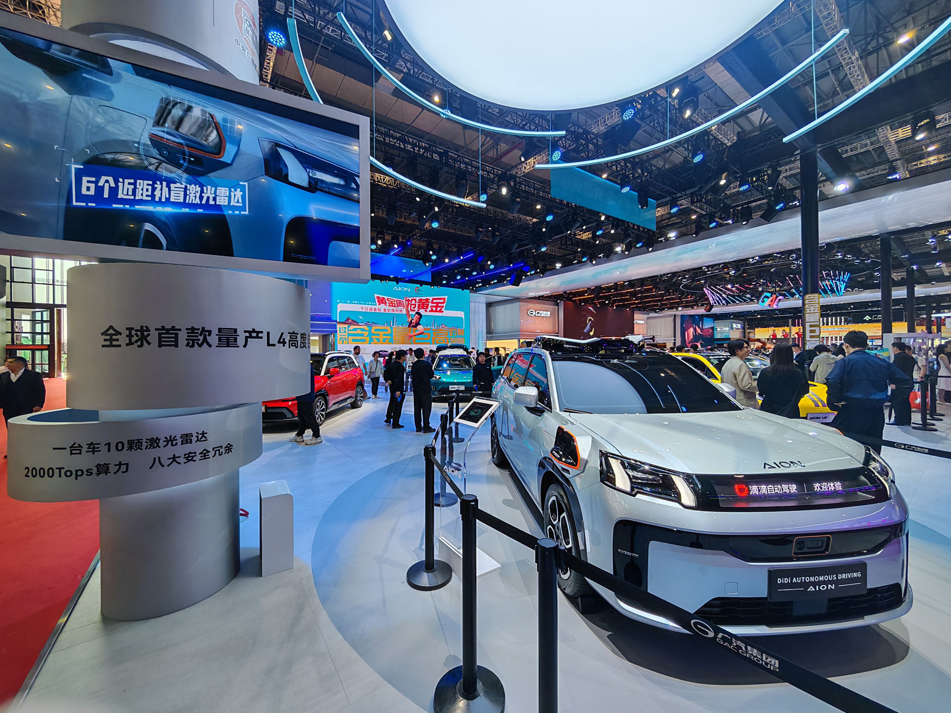 图为在第二十一届上海国际汽车工业展览会上展出的广汽埃安新能源汽车股份有限公司和北京小桔科技有限公司推出的前装量产L4级高度自动驾驶车。该车计划于2025年底交付,2026年实现规模化运营。记者 周武英 摄