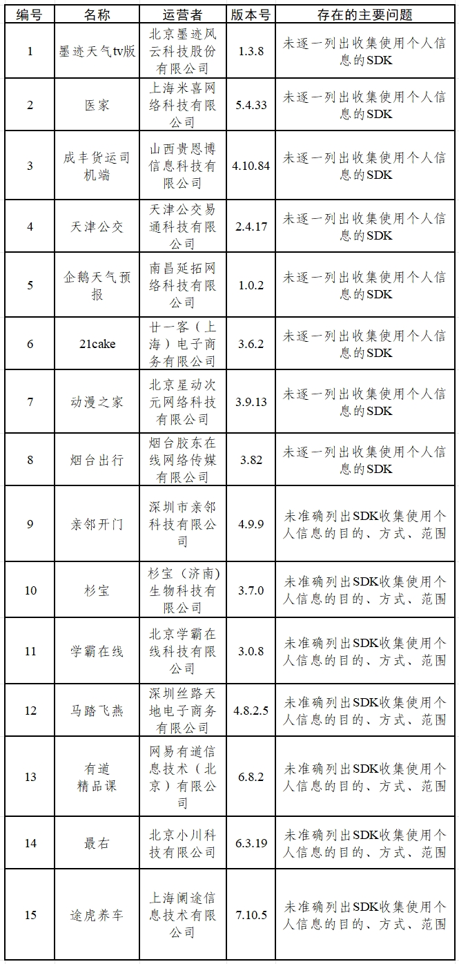 近日,中央网信办发布关于15款App和16款SDK个人信息收集使用问题的通报。墨迹天气tv版、医家、途虎养车等15款App存在未逐一列出收集使用个人信息的SDK,未准确列出SDK收集使用个人信息的目的、方式、范围等问题。