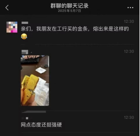 该网友表示,此金条系从银行提货去金店打算换成首饰,“好在没有开封,也问金店要了录像”“一开始银行想说是金店的(问题)。后来,朋友说金条编号、Logo都在,编号和银行单子对得上。”后续,该网友称,相关部门已与其朋友联系上。