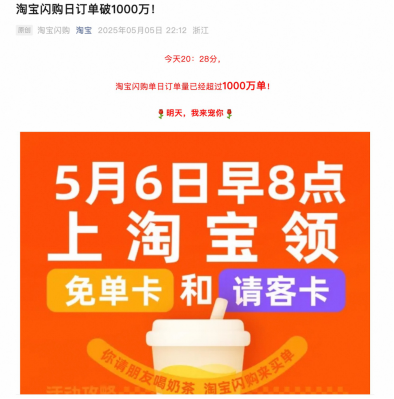 淘宝闪购日订单突破1000万,为全国消费者送“免单”