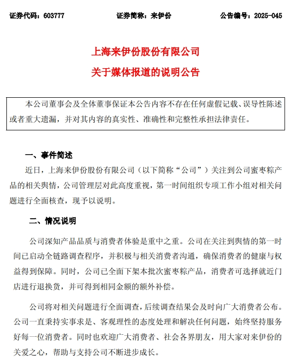 面对蜜枣粽引发的舆情,来伊份(603777.SH)于5月12日早间正式回应。