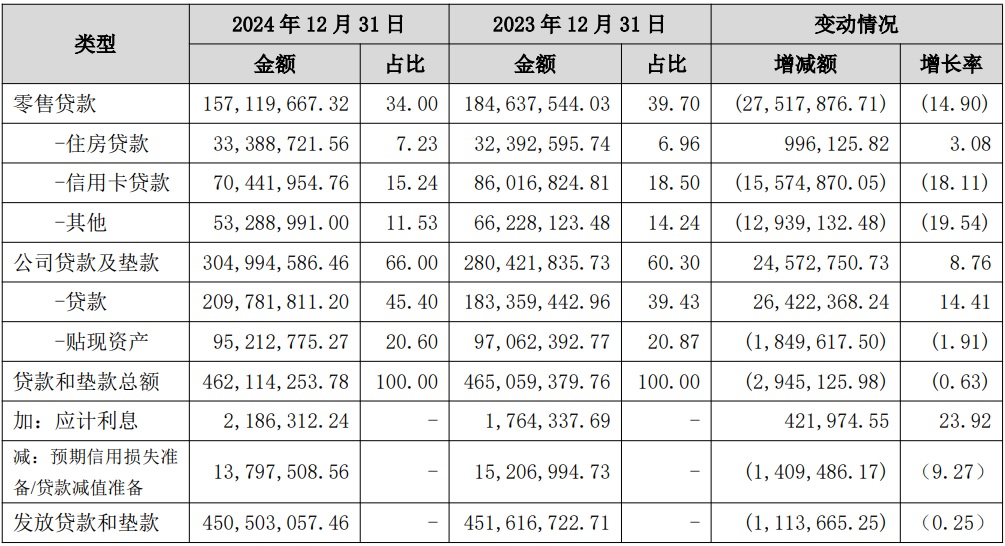 具体看,截至2024年末,广州银行的公司贷款及垫款为3049.95亿元,比上年增加245.73亿元,增幅8.76%;零售贷款为1571.20亿元,比上年减少275.18亿元,降幅14.90%。在零售贷款中,住房贷款、信用卡贷款、其他金额分别为333.89亿元、704.42亿元和532.89亿元,同比变动幅度分别为3.08%、-18.11%和-19.54%,在该行贷款和垫款总额中的占比分别为7.23%、15.24%和11.53%,除住房贷款占比提升,其他两类占比均有所下降。针对零售贷款余额减少,广州银行表示“主要是优化零售业务资产结构所致”。
