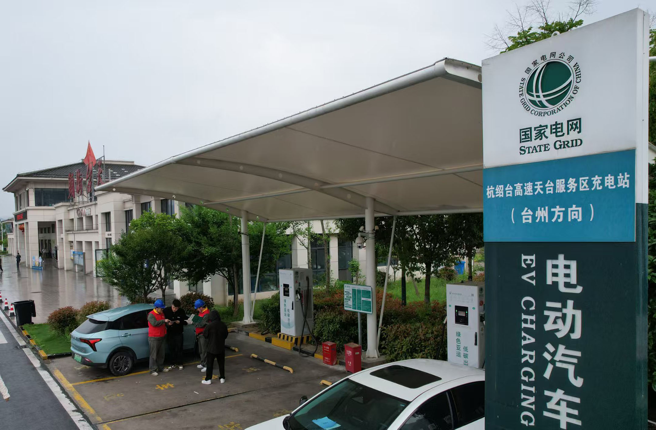 图为国网台州供电公司员工在浙江省苏台高速公路街头服务区的新能源汽车充电站内,热情引导自驾游新能源车主前往空位的充电桩,悉心为他们提供充电指导,保障续航顺畅无忧。