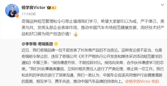 随后,浙江吉利控股集团高级副总裁杨学良也回应称:“奇瑞这种规范管理和令行禁止值得我们学习,希望大家都引以为戒,严于律己,美美与共,发挥头部企业表率作用,推动中国汽车市场规范健康发展,用好技术好产品和好口碑为用户创造价值。”
