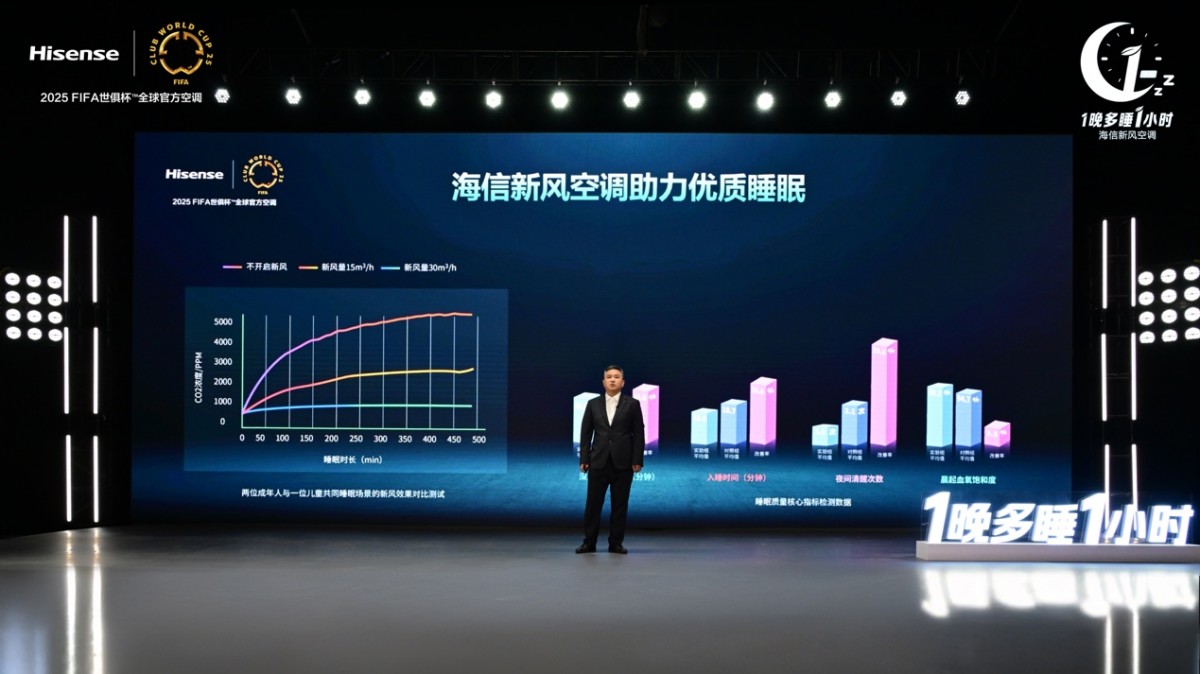 5月12日,在“1晚多睡1小时—海信新风生活方式发布会”上,海信正式推出新风空调健康睡眠解决方案,并联合中国睡眠研究会、中国家用电器研究院等多家权威机构正式发布《新风空调助眠白皮书》,白皮书以科学严谨的实验证明:海信新风空调凭借其新风增氧、高效净化以及极致静音的独特属性,能显著改善睡眠环境的空气质量,提升睡眠的舒适度,全方位实现睡眠效率的提升。在海信新风空调优化后的空气环境中,用户7小时的睡眠时长,可抵传统空调环境下8小时的睡眠效果,相当于 “1晚多睡1小时”。