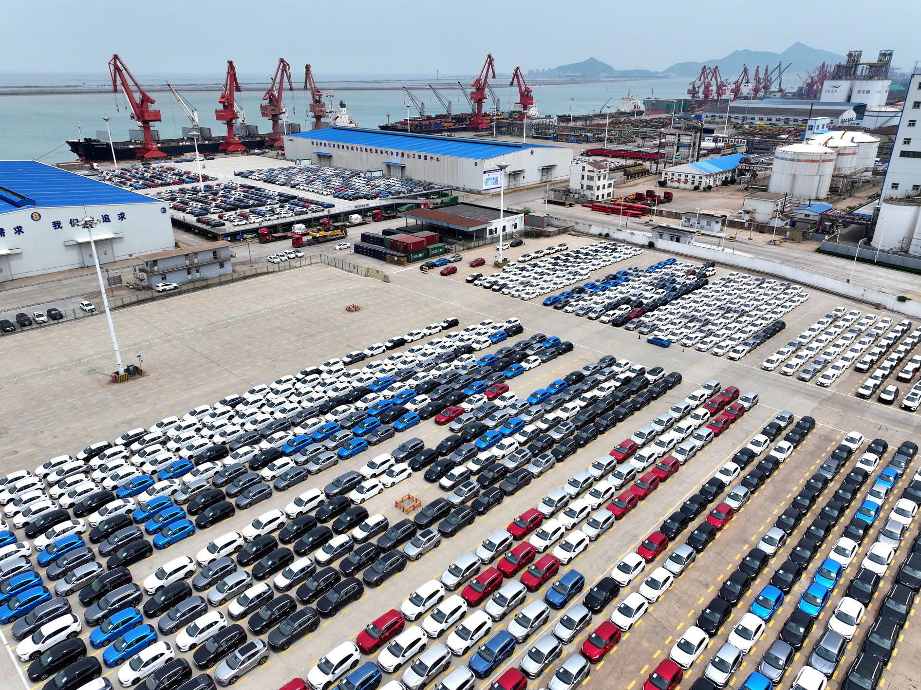 5月13日,在江苏省连云港港东方港务分公司码头,大批轿车集港准备装船出口(无人机照片)。