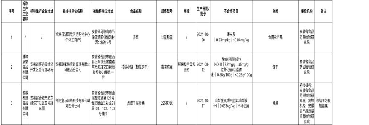 记者还注意到,在今年四月,安徽省市场监督管理局公布的食品安全抽检信息通告(2025年第13期)显示,合肥盒马网络科技有限公司第四分公司销售的、标称安徽都遇食品有限公司(合肥)生产的虎皮千层蛋糕,山梨酸及其钾盐(以山梨酸计)不符合食品安全国家标准规定。检验机构为安徽省食品药品检验研究院。检测结果显示,山梨酸及其钾盐(以山梨酸计)的含量为0.0334g/kg。安徽都遇食品有限公司对检验结果提出异议,并申请复检;经安徽省产品质量监督检验研究院复检后,维持初检结论。