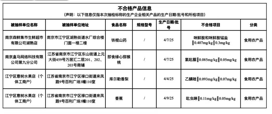 此外,合肥市蜀山区市场监督管理局公布的2025年第13期食品监督抽检信息显示,合肥盒马网络科技有限公司第七分公司销售的库尔勒香梨全母梨1kg(单果100g起(梨))(生产日期/批号:2025/01/14),乙螨唑指标不符合食品安全国家标准规定。检验结果为0.16mg/kg超过标准值规定的0.07mg/kg。
