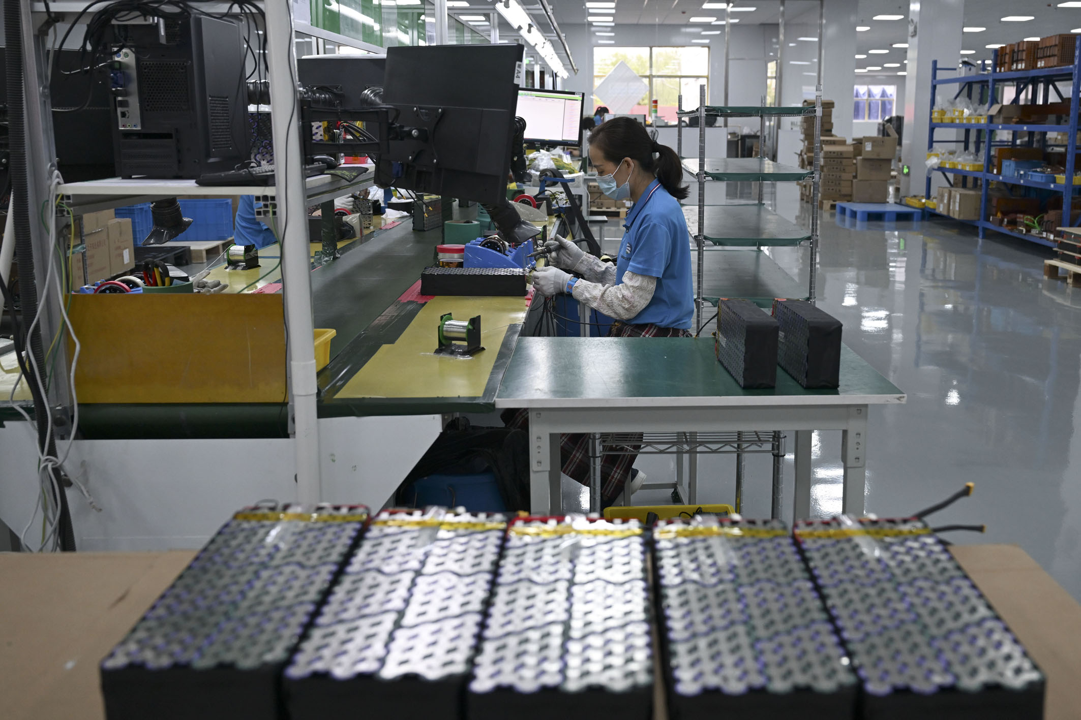 图为工作人员在安徽超锂电子科技有限公司的生产车间组装锂电池。