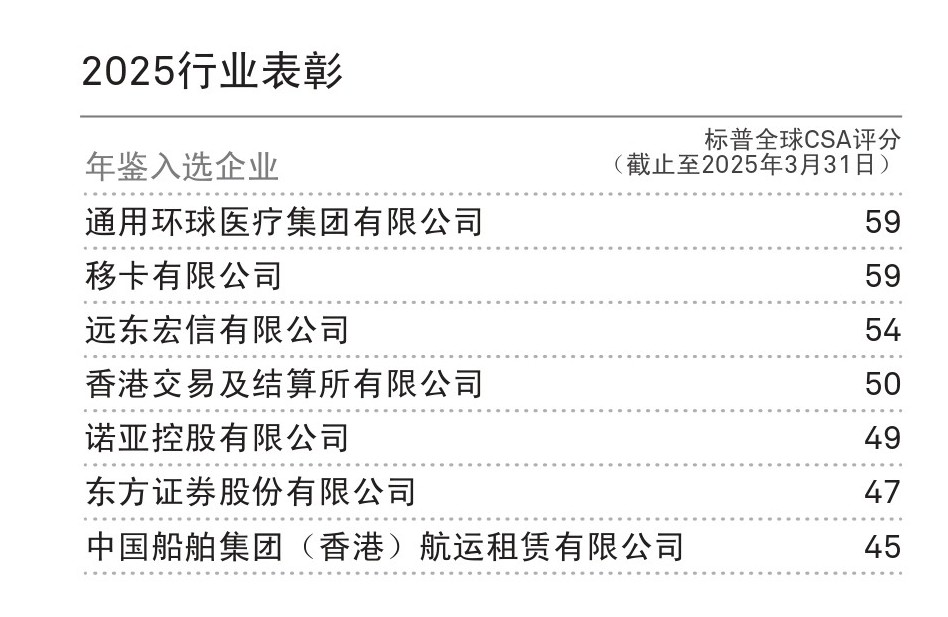 凭借CSA得分的大幅增长,东方证券于2024年首次成功入选该年鉴,2025年再次入选并成为当年度唯一入选的证券公司,标志着公司可持续发展管理能力持续进阶,入选年鉴的含金量进一步增强,体现出国际评级机构对公司可持续发展优势的高度认可。