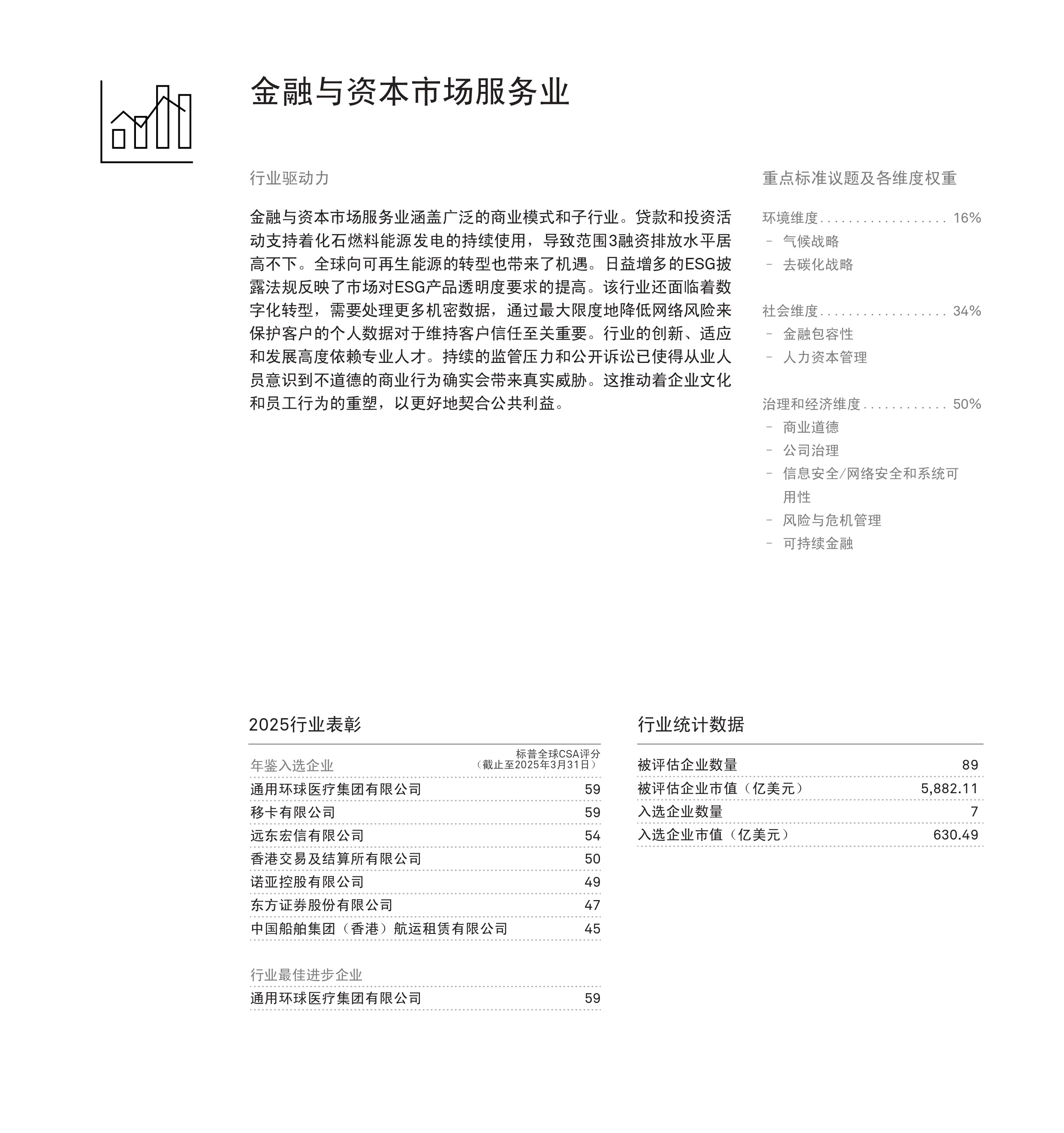 自2023年起,标普全球连续三年发布《可持续发展年鉴(中国版)》,旨在识别并表彰在各自行业中展现出可持续发展优势的中国企业,是评估企业可持续发展绩效的重要参考,综合反映企业可持续发展管理水平。在2025年度评选中,1662家企业参与评选,最终164家企业凭借行业领先的ESG实践水平成功入选年鉴,其中,“金融与资本市场服务业”仅有7家企业入选,东方证券是唯一入选的证券公司。