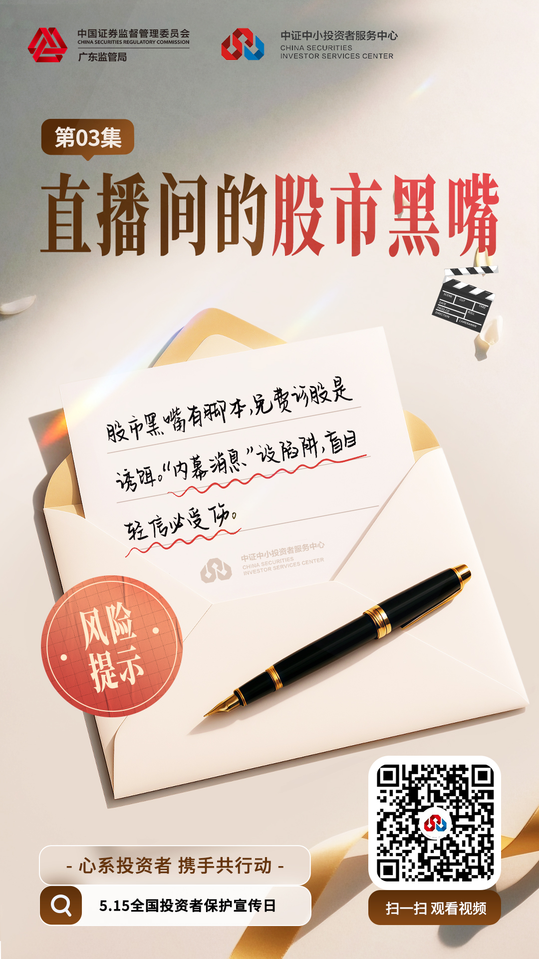 在5·15全国投资者保护宣传日来临之际,中证中小投资者服务中心联合广东证监局推出《股东来了》(2025)《防非打非在行动!》系列短视频,聚焦股市“黑嘴”、非法荐股、股市“小作文”等常见非法证券活动,揭秘骗局、揭示风险,助投资者树立理性投资理念。