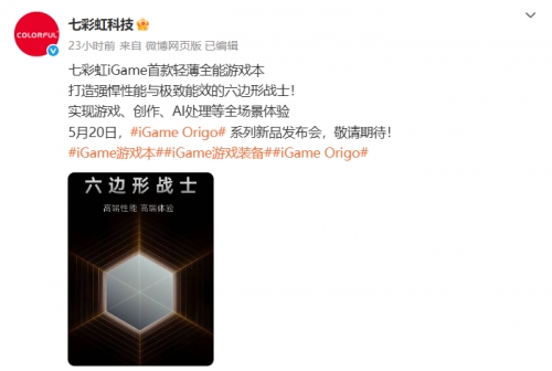 七彩虹iGame Origo系列轻薄全能游戏本新品发布会将于5月20日19:00举行,主题为“全能智胜”。发布会将同时发布iGame Origo M16与iGame Origo M15两款新品游戏本和揭晓更多七彩虹在AI PC上的产品体验。