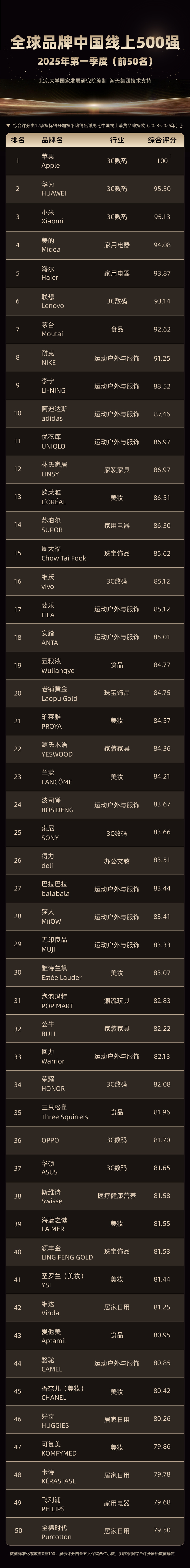 品牌总榜的前三名依次是苹果、华为和小米,均属于3C数码行业。苹果的成交金额指标突出,印证了它在中国市场的影响力;与此同时,华为和小米的成交金额增速已显著超过苹果,并在品牌词搜索量、会员运营等关键指标上表现出一定优势,展示了本土品牌在开放市场环境中的成长性与竞争力。