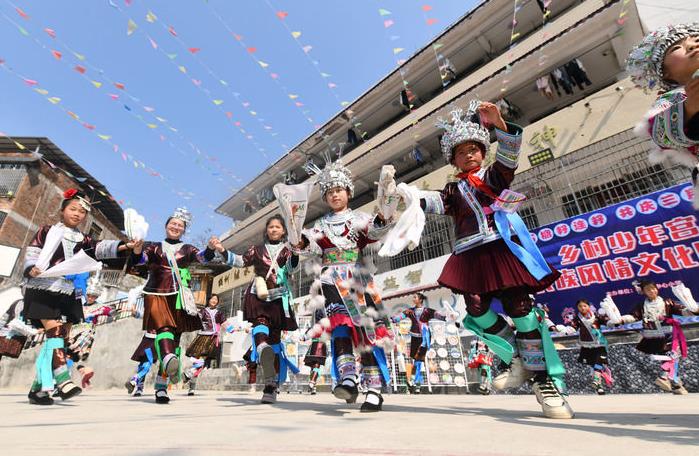 2025年3月25日,广西柳州市融水苗族自治县杆洞乡中心小学学生在跳芦笙踩堂舞。新华社记者 黄孝邦 摄