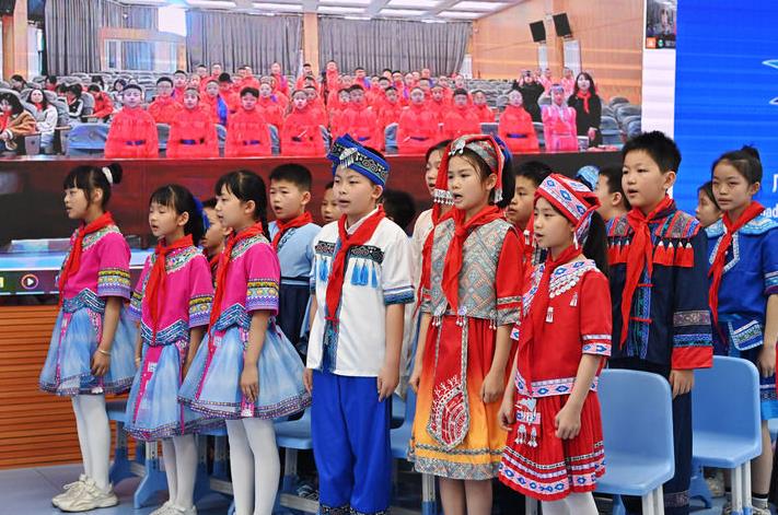 2025年3月28日,在“壮蒙一家亲 共筑中国梦”手拉手主题云队会上,广西南宁市滨湖路小学四(1)中队队员通过网络和内蒙古鄂尔多斯东胜区第十二小学四(9)中队队员一起唱《中国少年先锋队队歌》。新华社记者 周华 摄