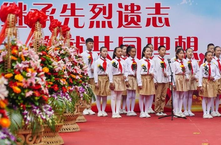2024年9月30日,四川省眉山市彭山区向英雄烈士敬献花篮仪式在彭山区烈士陵园举行,少先队员在仪式上合唱《我们是共产主义接班人》。新华社发(翁光建 摄)