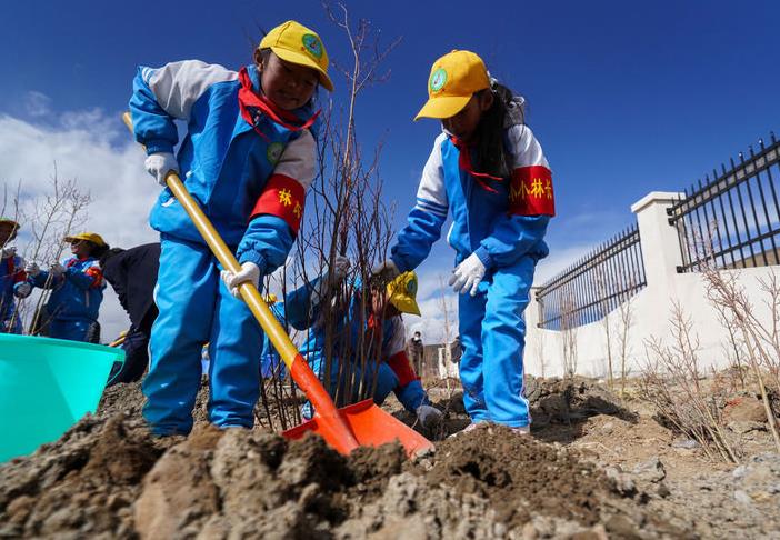 2025年4月25日,西藏那曲市小学生在植树。新华社记者 晋美多吉 摄