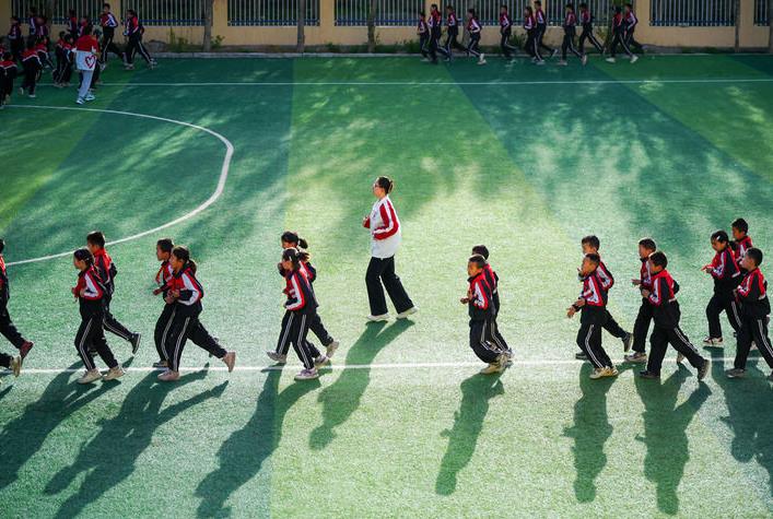 2025年4月24日,在新疆克州阿图什市哈拉峻乡谢依特小学,支教教师带领学生晨跑。新华社记者 徐宏岩 摄