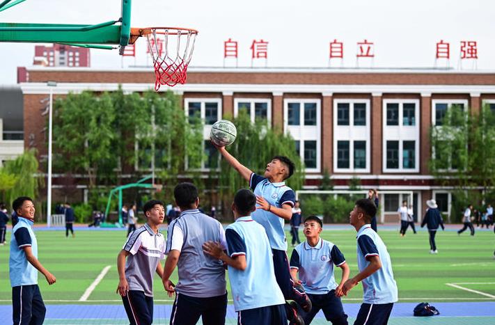 2024年6月18日,学生在青海果洛西宁民族中学打篮球。新华社记者 张龙 摄