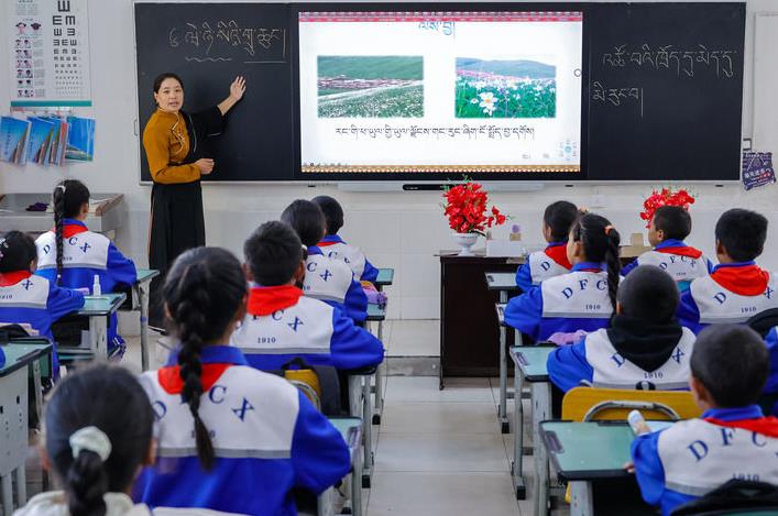 2024年9月27日,在四川省甘孜藏族自治州道孚县城关第一完全小学,采取“藏加模式”教学的五年级一班的藏语文课上,准木周老师指导藏族学生以家乡草原风物为主题写作藏语文作文。新华社记者 沈伯韩 摄