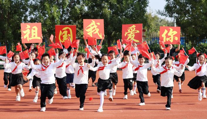 2024年9月29日,山东省临沂市郯城县第一实验小学学生手持国旗快乐奔跑,喜迎国庆节。新华社发(张春雷 摄)