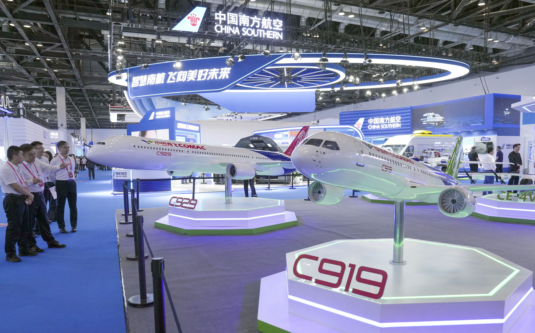5月26日,参观者在第三届民航科教创新成果展的中国商飞展区参观。当日,以“创新领航 智连世界”为主题的第三届民航科教创新成果展在北京国家会议中心开幕。展览展出面积2.2万平方米,由100余家参展单位组成七大特色展区,聚焦教育、科技、人才三大领域,集中展示我国民航自主创新技术和国产民机、无人机等先进制造技术成果。