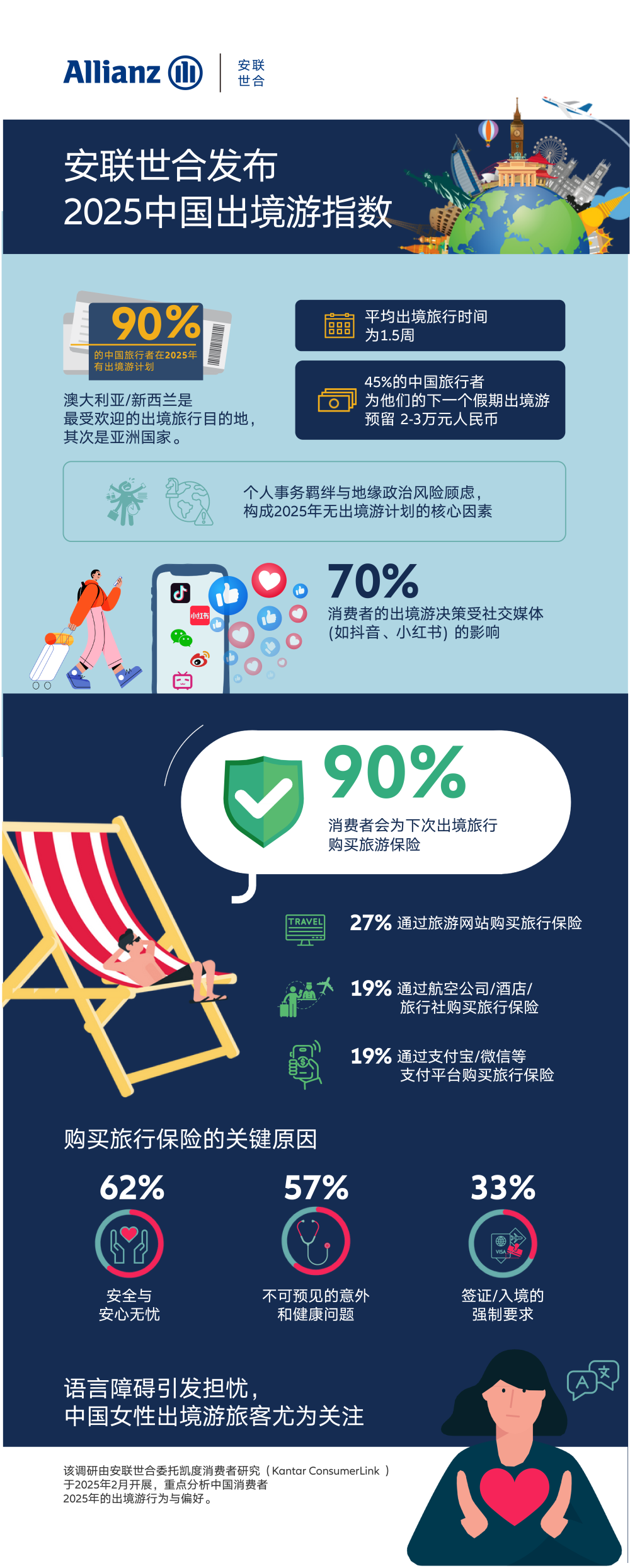 《2025中国出境游指数》由安联世合委托凯度消费者研究(Kantar ConsumerLink)于2025年2月开展,重点分析中国消费者2025年的出境游行为与偏好。安联世合作为集救援与保险服务解决方案于一体的服务提供商,致力于在移动出行、救援、旅行等专业领域提供全球保障服务。