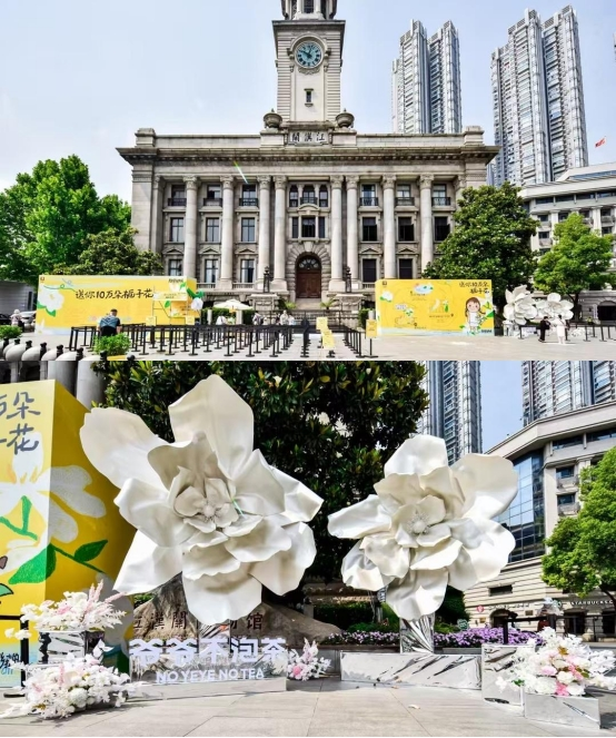 在武汉江汉关主会场,由武汉市文化和旅游局主导打造的“限时栀子三件套”——4米高的巨型栀子花装置、花瓣斑马线、栀子安全岛,为市民营造出一组浪漫而鲜明的街头花香场景。