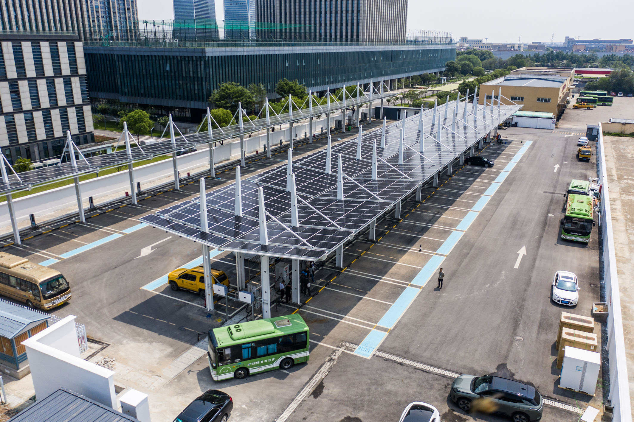 5月27日拍摄的湖州长兴公交总站光储充一体化公交充电站(无人机照片)。