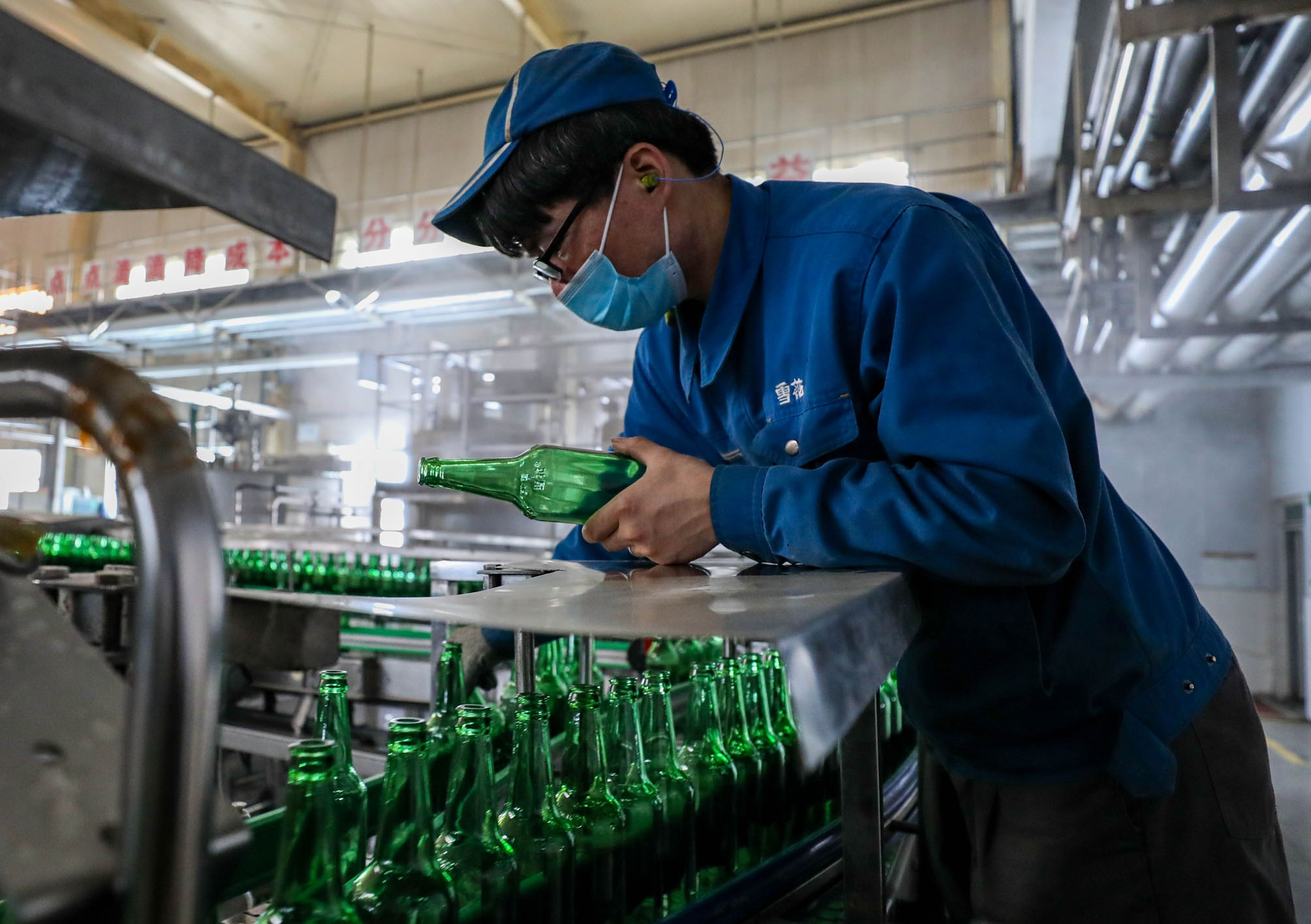 图为华润雪花啤酒(兴安)有限公司的工人在洗瓶机上作业。资料照片
