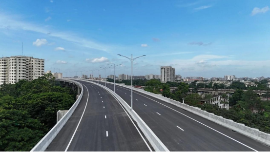 在孟加拉国,由集团投资建设运营的达卡机场高架快速路项目(一期)已通车近两年。从空中俯瞰,这条高速路从首都达卡阿贾拉勒沙迦国际机场,纵穿达卡市区,到达南部的贾特拉巴立,连接达卡吉大港公路,是孟加拉国最重要的公路和商业生命线之一。