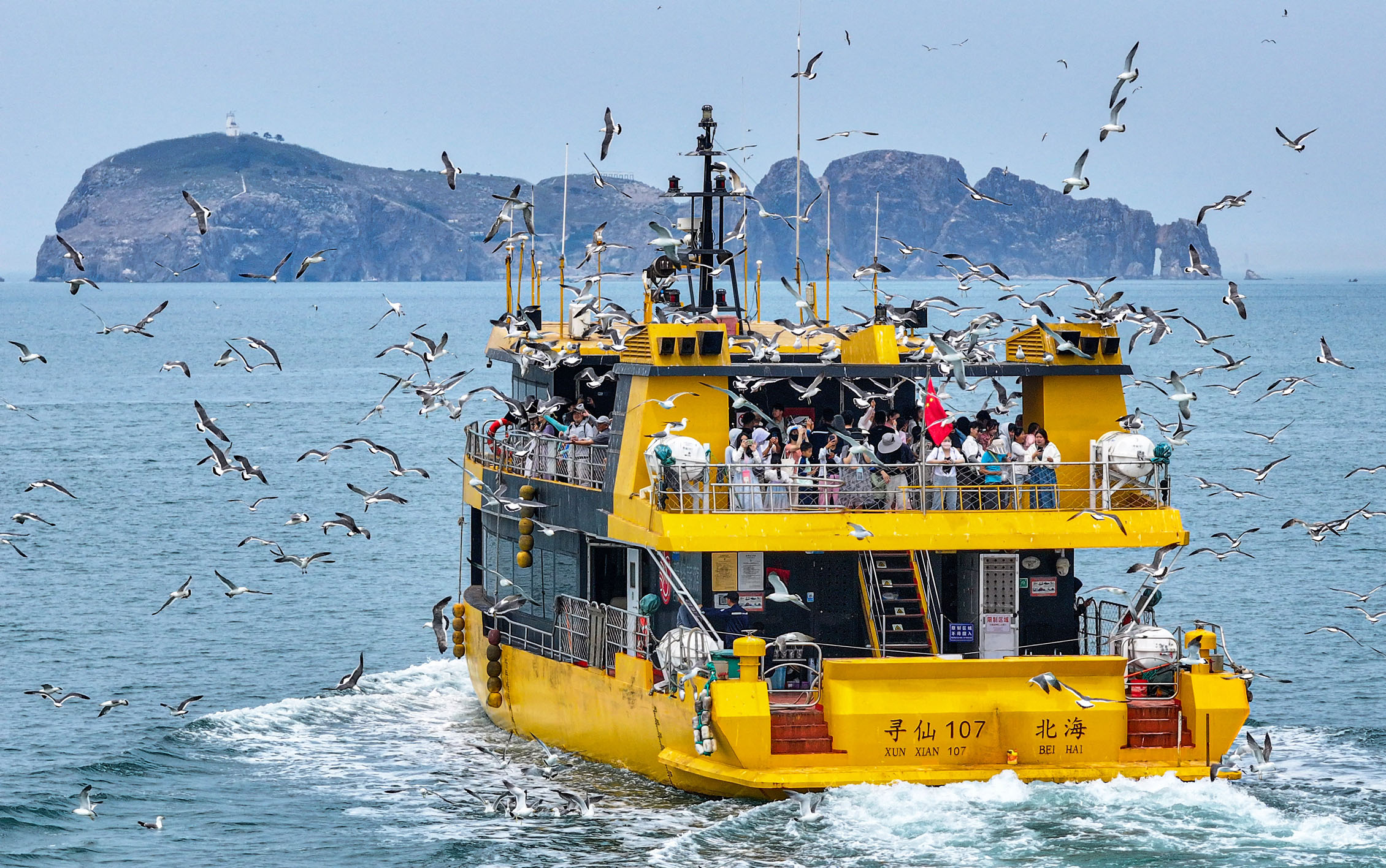 6月1日,在山东省荣成市海驴岛海域,游客乘船出海与海鸟互动(无人机照片)。
