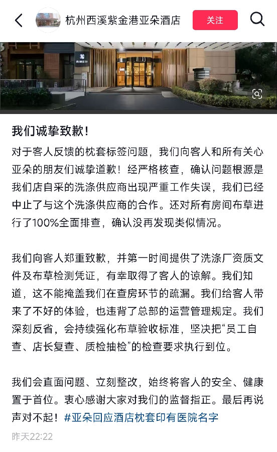 对于客人反馈的枕套标签问题,我们向客人和所有关心亚朵的朋友们诚挚道歉!经严格核查,确认问题根源是我们店自采的洗涤供应商出现严重工作失误,我们已经中止了与这个洗涤供应商的合作。还对所有房间布草进行了100%全面排查,确认没再发现类似情况。