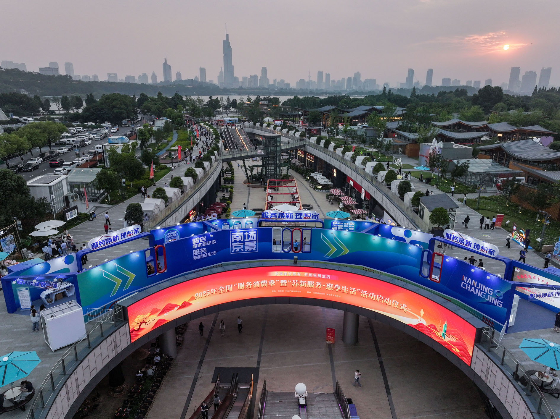这是2025年全国“服务消费季”暨“苏新服务·惠享生活”活动现场(6月3日摄,无人机照片)。当日,2025年全国“服务消费季”暨“苏新服务·惠享生活”活动启动仪式在江苏省南京市举行。本次活动以“乐享美好服务 共创幸福生活”为主题,按照“政府引导、市场运作、创新增效、提质惠民”原则,聚焦餐饮、住宿、家政、养老、文娱、旅游、体育、健康等10多个领域,将组织开展160余项服务消费促进活动。