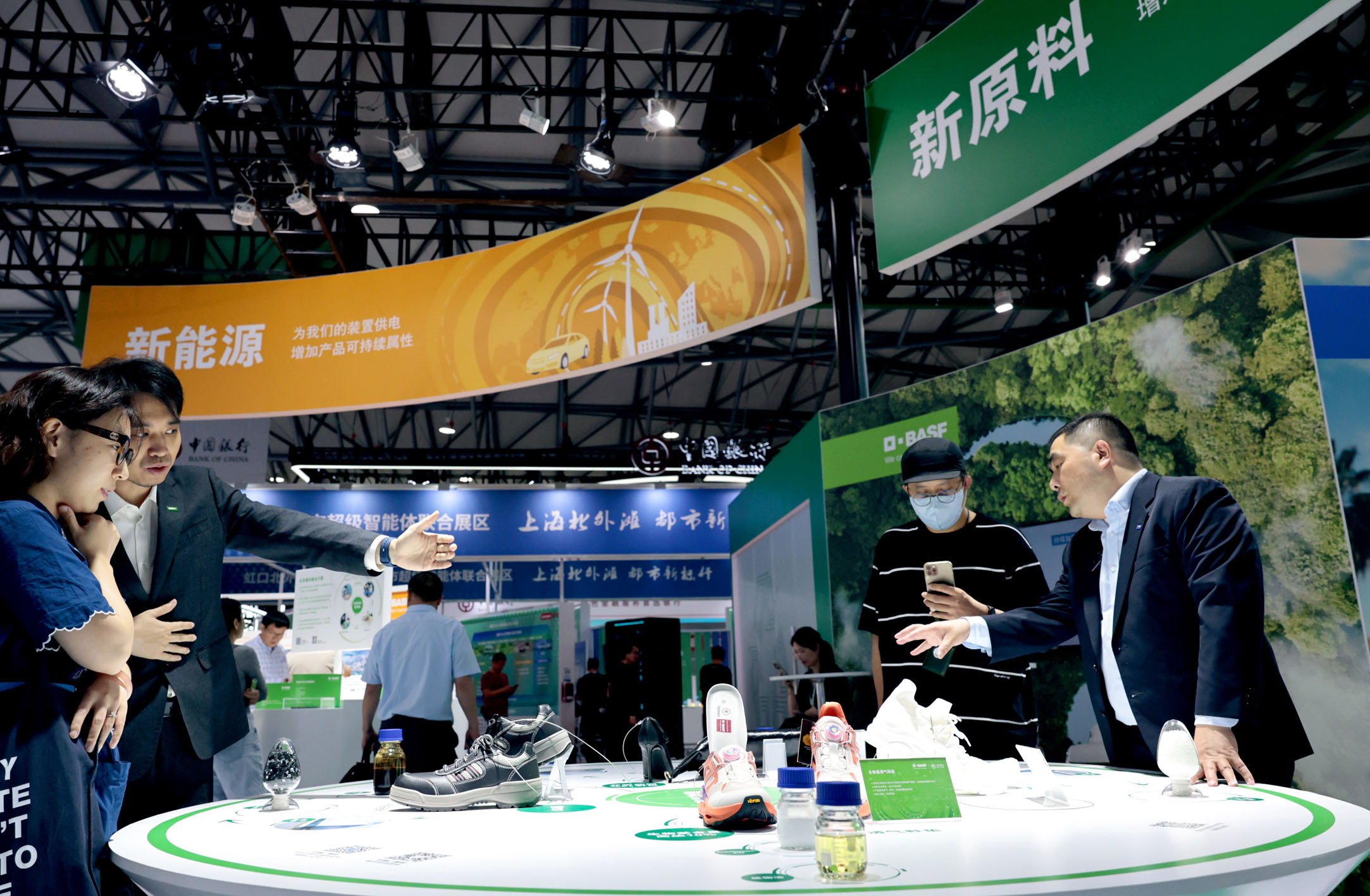 6月5日,工作人员在一组新材料应用产品展示台前向参观者做介绍。当日,以“走向碳中和之路”为主题的2025上海国际碳中和技术、产品与成果博览会在上海新国际博览中心开幕。本届博览会围绕“应用驱动绿色转型”,由主题展览、系列论坛、贸易对接三大板块构成,来自德国、荷兰、日本、英国等15个国家和地区的逾300家行业企业全方位展示全球碳中和领域的前沿成果与实践。