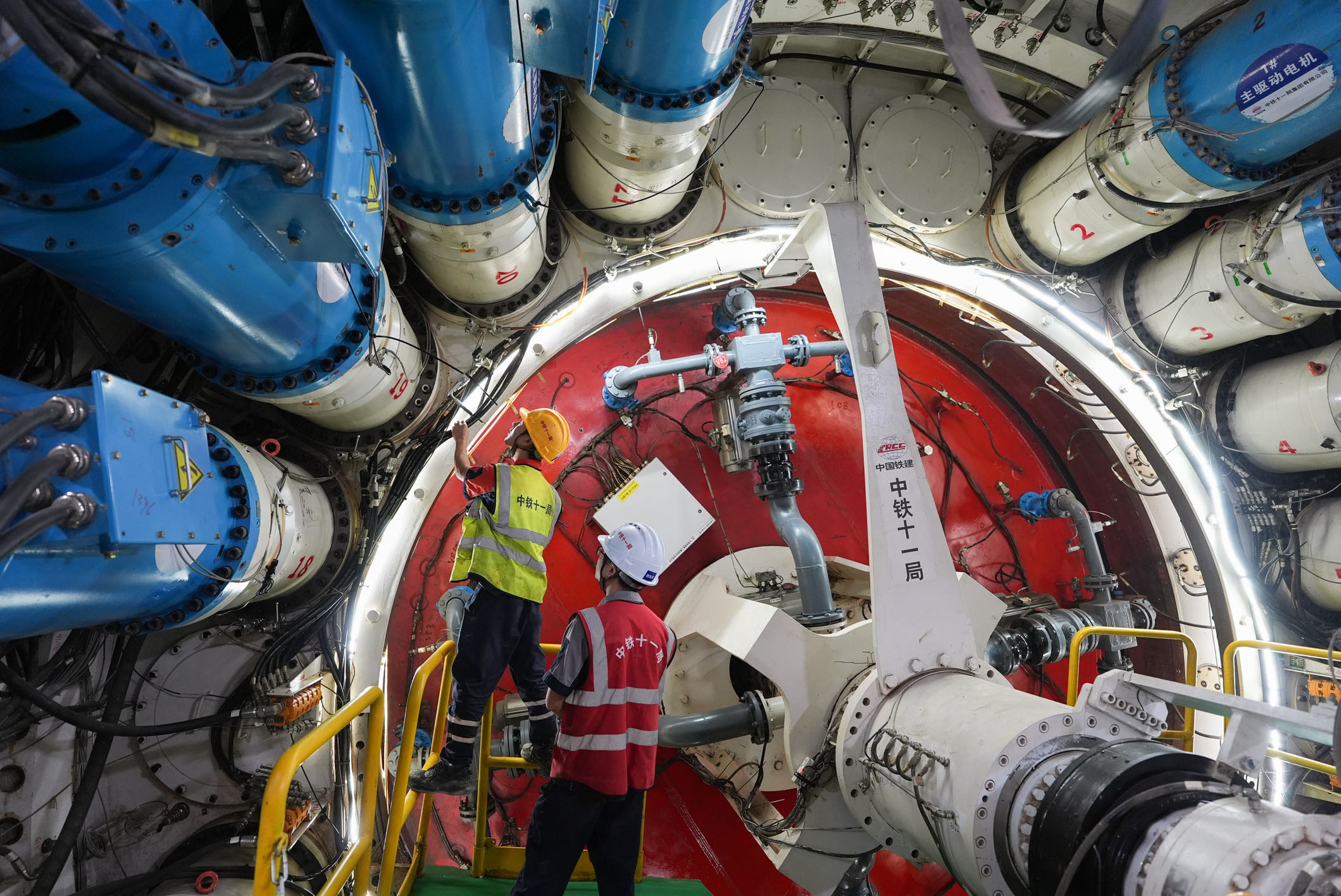 6月5日,中铁十一局技术人员在甬舟铁路金塘海底隧道“定海号”盾构机内关注设备运行情况。当日,在甬舟铁路金塘海底隧道舟山侧海平面下约60米深处,“定海号”盾构机掘进里程突破3135米,标志着长6270米的金塘海底隧道舟山侧盾构施工完成过半,工程建设取得新进展。甬舟铁路金塘海底隧道西起浙江宁波市北仑区,东至舟山市金塘镇,全长16.18公里,是世界最长海底高铁隧道。