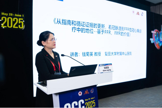 活动期间,复旦大学附属中山医院副院长钱菊英教授进行了主题为《从指南和循证证据的更新,看冠脉造影FFR在冠心病诊疗中的地位——基于FFR、IMR的价值》的主旨演讲。她指出:“冠状动脉血流受心外膜冠脉和心肌内微循环影响,过去单纯评估心外膜冠状动脉狭窄程度存在局限。随着2024 ESC指南对于慢性冠状动脉综合征(CCS)定义的变更,我们需要重新审视冠心病发病机制,积极推动冠心病传统诊疗模式的转变:从单纯‘心外膜’冠脉功能学评估,到‘心外膜+微循环’冠脉功能学全面评估,从缺血转向动脉粥样硬化性冠状动脉疾病。”