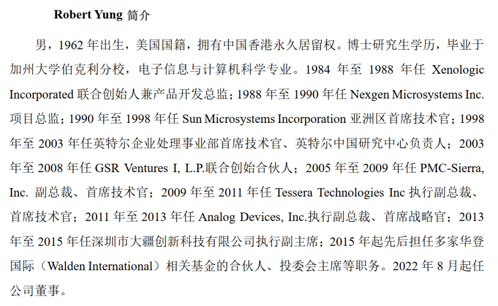 华胥基金入股辉芒微后,Robert Yung亦自2022年8月起任公司董事(简介如下图所示)。