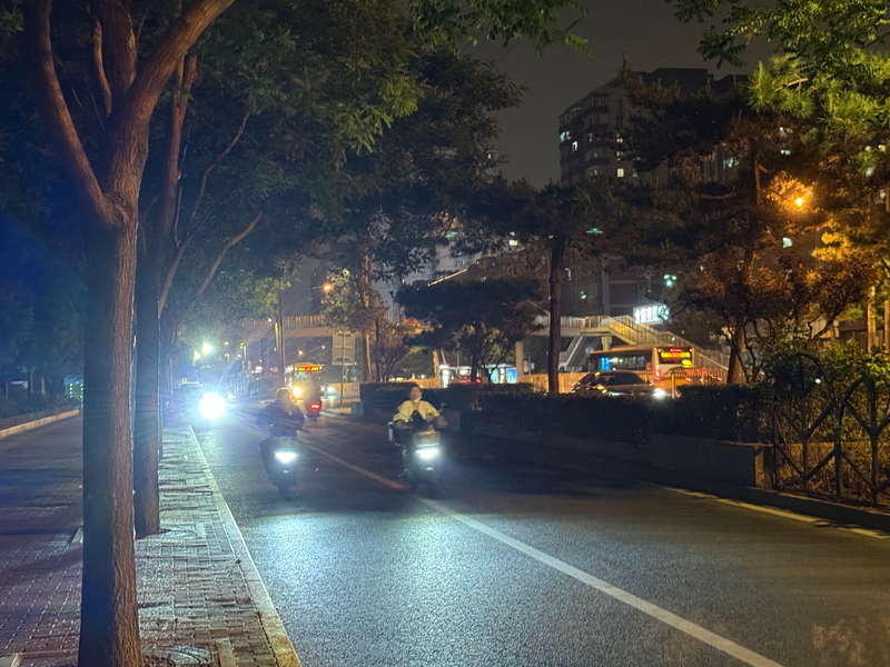 夜间,在朝阳区劲松路辅路,远处的电动自行车远光灯“目光灼灼”。新京报记者 田杰雄 摄