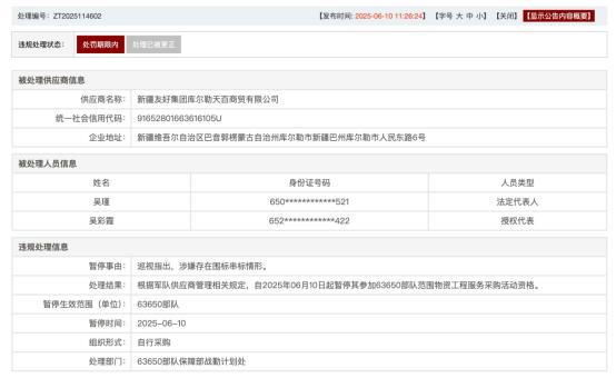 公告显示,巡视指出,新疆友好集团库尔勒天百商贸有限公司(以下简称“库尔勒天百商贸公司”)涉嫌存在围标串标情形,根据军队供应商管理相关规定,自2025年6月10日起暂停其参加63650部队范围物资工程服务采购活动资格。在暂停期内,法定代表人吴瑾控股或管理的其他企业暂停参加上述范围军队采购活动,授权代表吴彩霞暂停代理其他供应商参加上述范围军队采购活动。