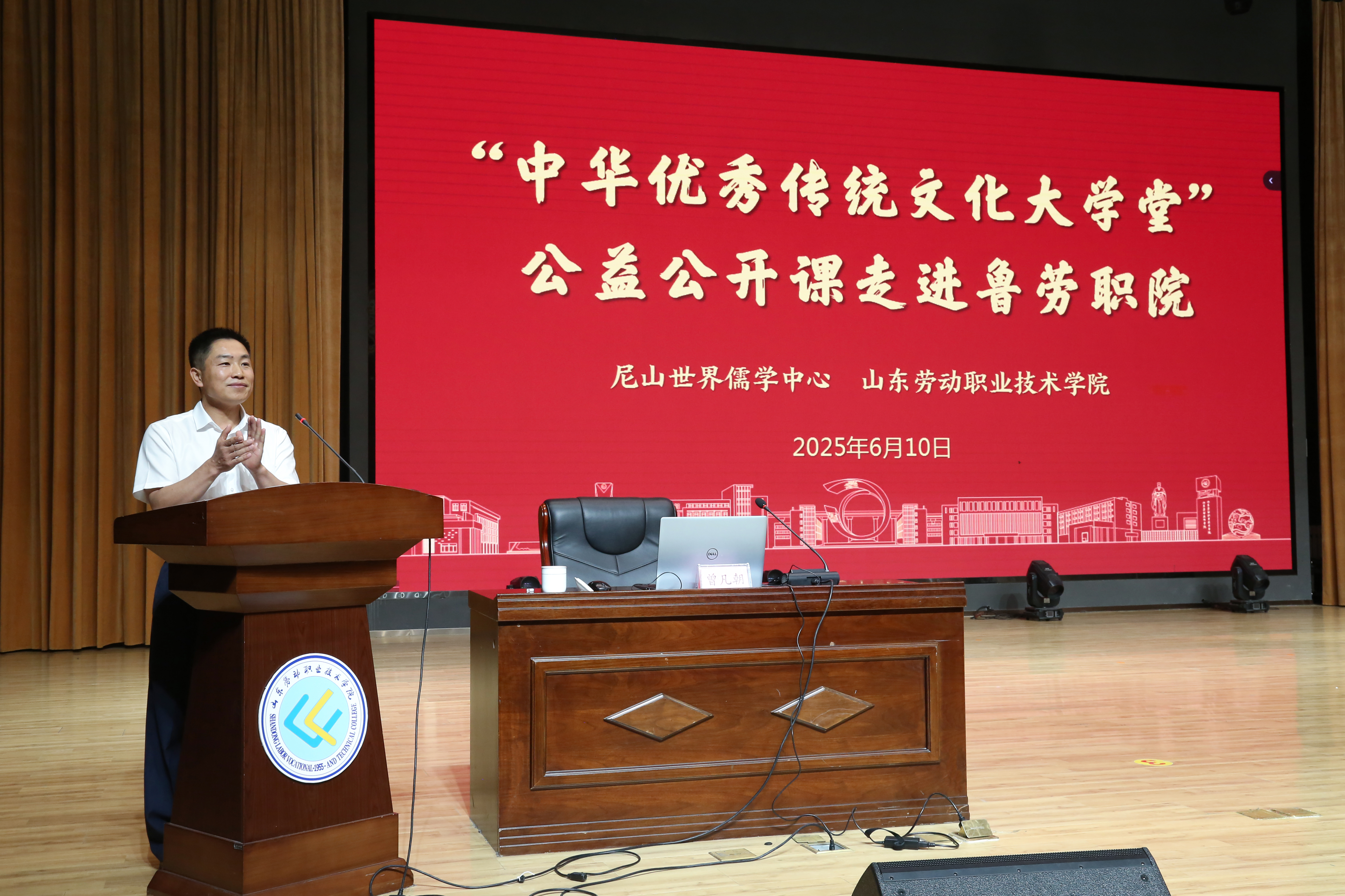 6月10日上午,由省委宣传部与尼山世界儒学中心共同策划的“中华优秀传统文化大学堂”公益公开课走进山东劳动职业技术学院,在长清校区报告厅开讲。山东大学中国哲学博士、历史学博士后,齐鲁师范学院教授曾凡朝以《“学而时习之”——悦读经典,淬炼出彩人生》为题作讲座,讲座由学院党委委员、宣传部部长宋爱全主持,省直文明单位二十四协作区单位代表、学院教职工、在校学生等共450余人参加活动。