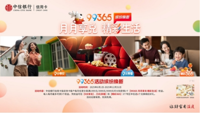 除“618”专项活动外,为更好赋能线下场景,中信银行信用卡围绕消费者生活消费需求,焕新升级“99365”活动,覆盖“食、住、行、娱、购”等各类消费场景,为更多消费者带来福利惊喜。