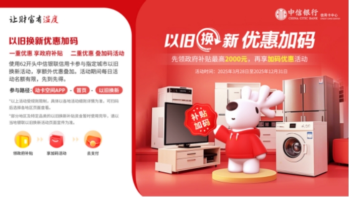 为响应国家“以旧换新”政策,中信银行信用卡推出“以旧换新,优惠加码”专项优惠活动。持卡用户可先领政府补贴优惠(最高2000元)购买指定家电、3C等品类商品,再通过指定商户使用62开头中信银行银联信用卡支付,可额外叠加中信银行银联信用卡专属优惠。该活动已覆盖江苏、四川、福建、上海、重庆、海南、辽宁、山东、广东、浙江、宁夏、广西、陕西、贵州、河北等20个省、自治区、直辖市。
