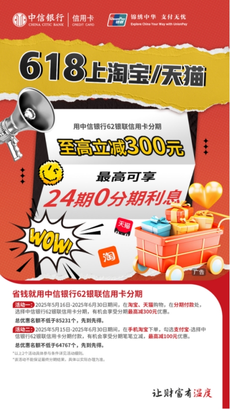 为进一步惠及持卡用户,中信银行信用卡聚焦“618”节点中“大件购买”的需求,联合京东、淘宝、天猫、支付宝等主流电商及支付平台推出分期满减优惠活动,用户至高可享24期免息并立减300元。