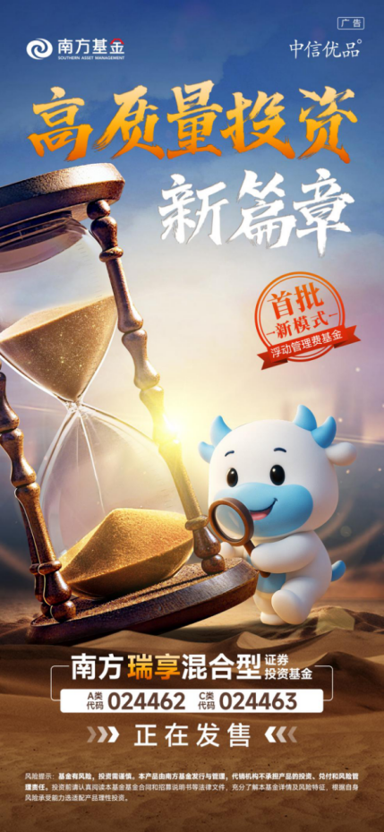 为积极响应中国证监会《推动公募基金高质量发展行动方案》(简称《方案》)的号召,南方基金推出了全新浮动费率基金——南方瑞享混合型证券投资基金(简称:南方瑞享混合;基金代码A类:024462,C类:024463),该产品通过创新机制与专业管理,有望为投资者提供差异化的权益投资选择。目前该产品已准入中信财富委资产配置委员会打造的“中信优品”产品池,由中信银行和中信证券联袂重磅发售。