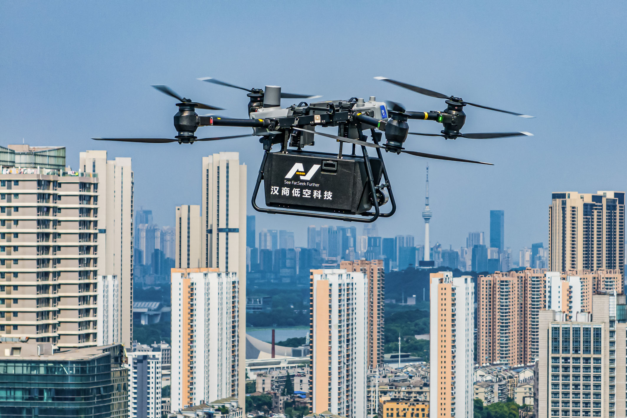 6月16日,一架无人机在飞行中(无人机照片)。当日,飞行服务航线连接武汉三镇(武昌、汉口、汉阳)核心区域的汉商低空港正式投入运营。据了解,汉商低空港由汉商集团旗下汉商低空科技有限公司建设运营,目前形成由1个数字化实时调度平台、2个智慧指挥中心、10条低空航线、22个智能停机坪组成的专业化低空物流运营体系,主要服务于海鲜、鲜切花、医药品等商品的配送和应急保障,可实现飞行路径动态规划、设备状态实时监测与货物全流程追溯。