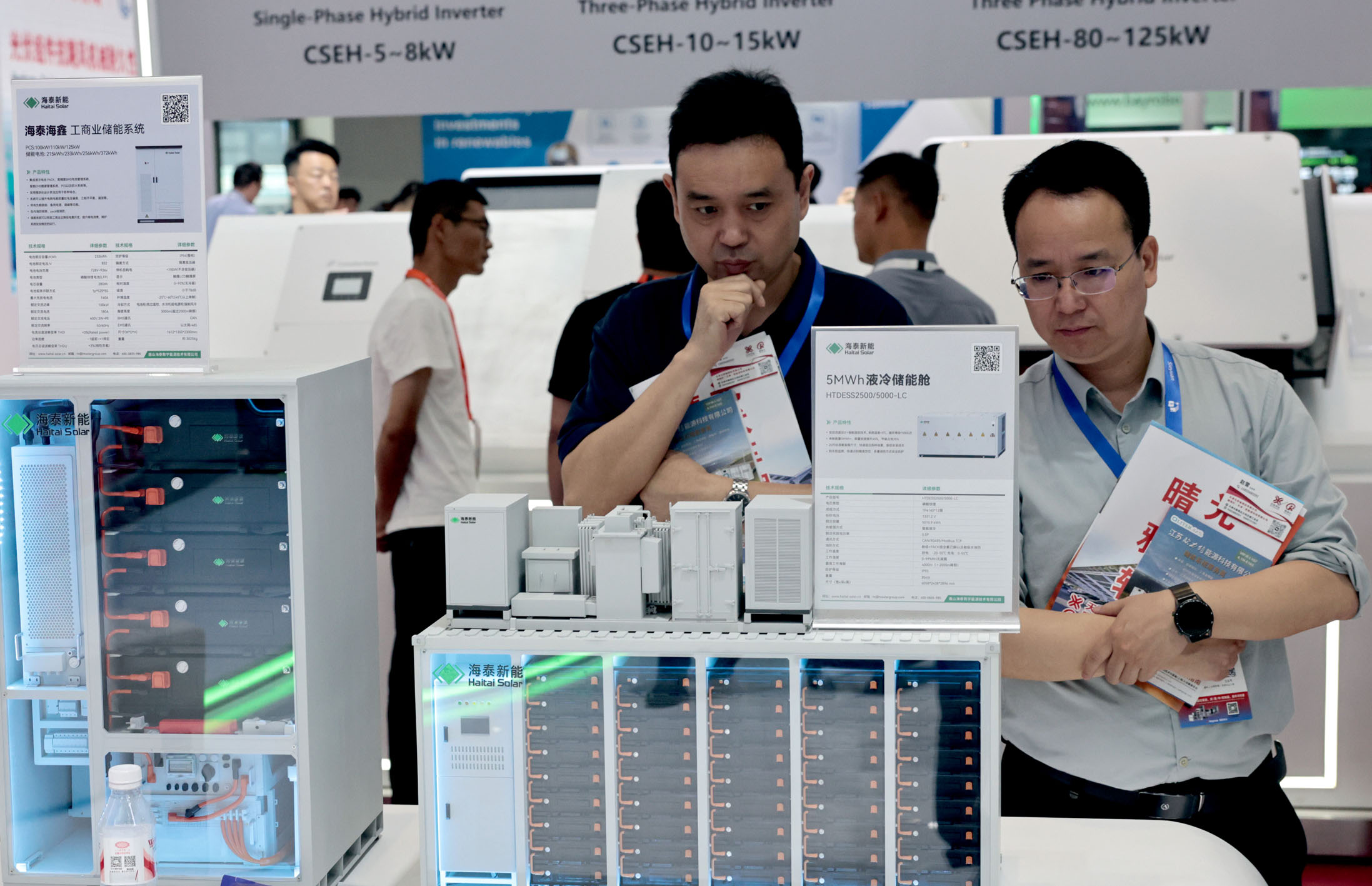 参观者在日前举行的第十八届(2025) 国际太阳能光伏和智慧能源&储能及电池技术与装备(上海)展览会期间观看一组储能设备模型展品。 新华社记者 方喆 摄