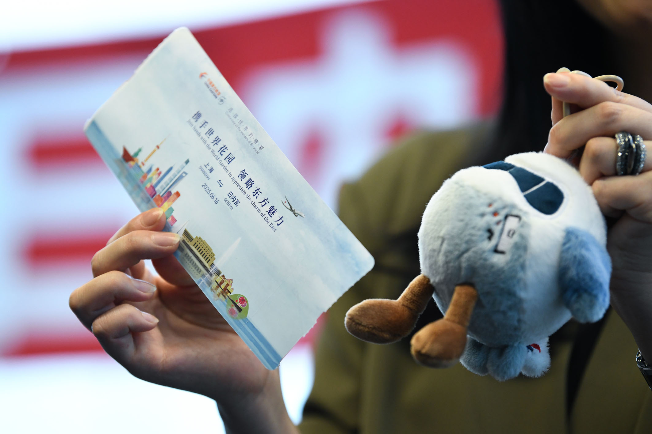 6月16日,在瑞士日内瓦国际机场,MU217航班乘客展示为纪念上海至日内瓦首条直飞航线开通制作的登机牌和纪念品。中国东方航空公司上海至日内瓦直飞航线16日正式开通。当地时间早上7时25分,从上海浦东国际机场起飞的MU217航班平稳降落在瑞士日内瓦国际机场,缓缓穿过象征民航最高礼仪的“水门”,圆满完成从“东方明珠”上海到“和平之都”日内瓦的首航。
