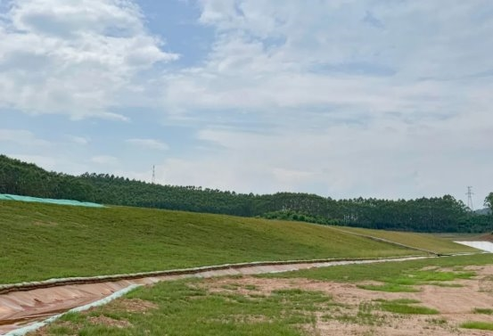 二是滩面生态重构与污染阻隔技术运用。项目按2%-6%坡度进行滩面平整与排水优化,形成“中间低、四周高”的排水格局,让雨水能迅速疏导。滩面铺设1.5mm-2.0mm厚光面、粗糙HDPE膜和5mm土工复合排水网,覆盖面积10.27万平方米,相当于14个标准足球场;锚固沟尺寸0.8m×0.8m,采用黏土回填压实,有效阻隔雨水入渗,渗滤液年产生量趋近于零。表层覆盖300mm厚植被土,精心播撒草籽后细心养护,监测显示,6个月内植被覆盖率达85%。